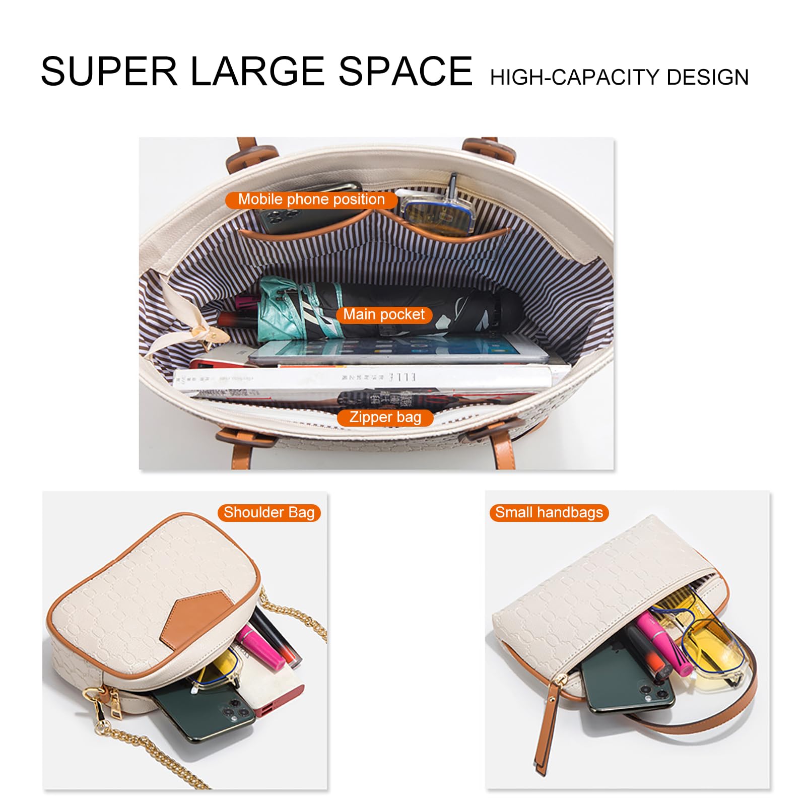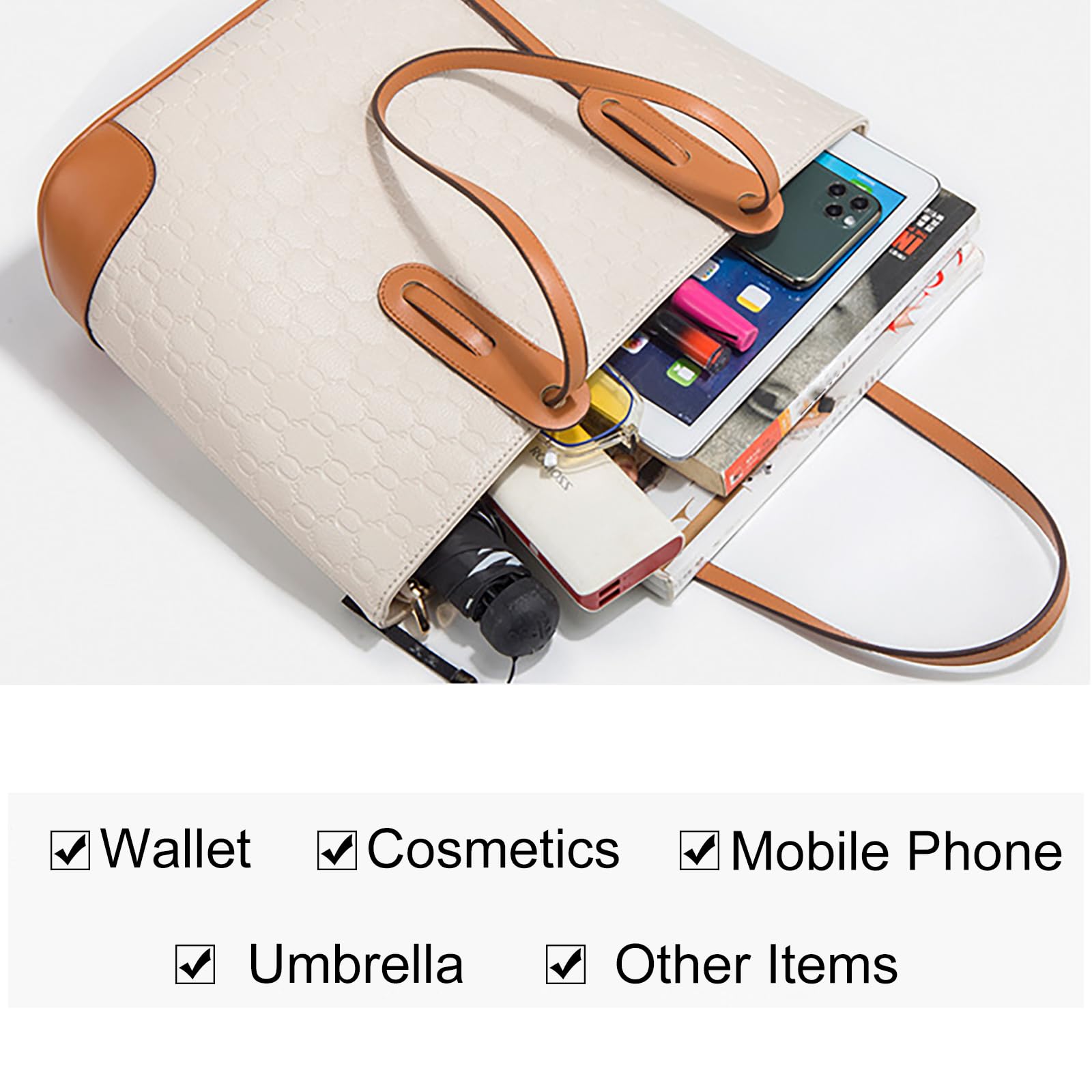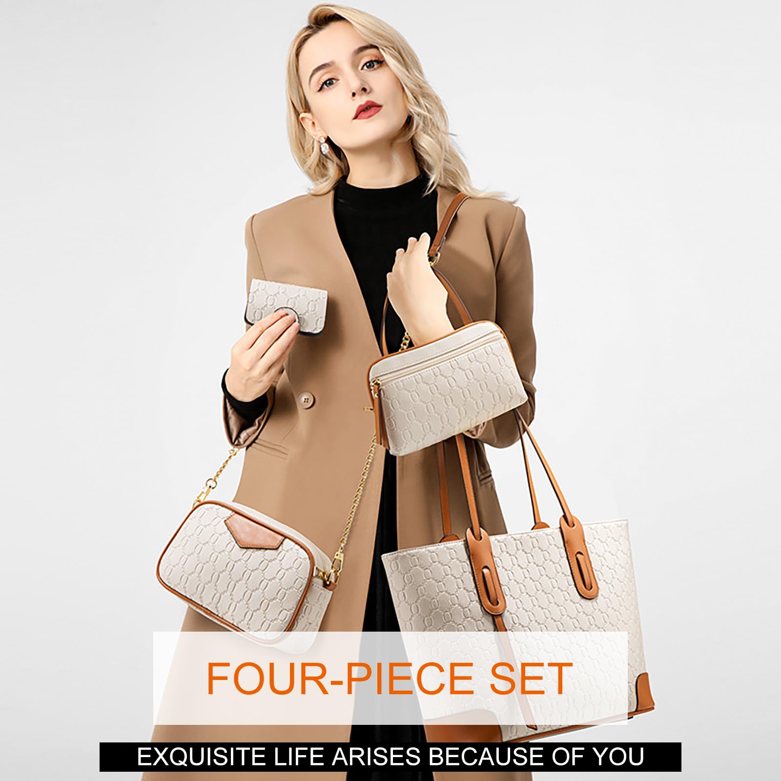 VN-B14Women’s 4-Piece Tote Bag Set – Vintage Monogram Pattern, PU Leather, Large & Stylish